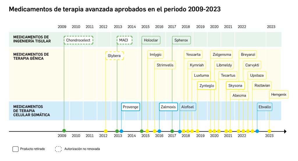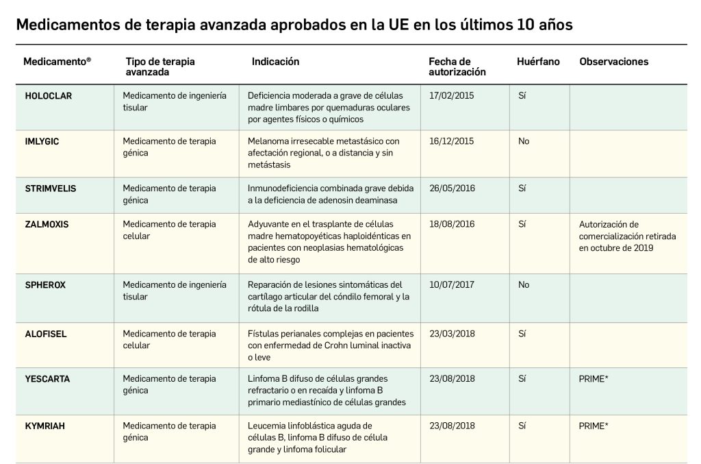 La siguiente tabla recoge los medicamentos de terapia avanzada que han recibido autorización de comercialización en la UE durante en los últimos 10 años (2013-2023).