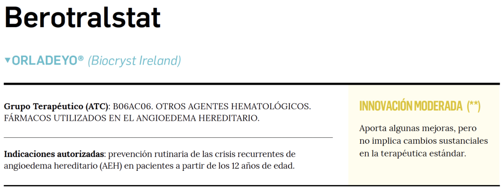 El posicionamiento de berotralstat en el arsenal terapéutico se complica por la ausencia de comparaciones directas con las otras alternativas aprobadas en su indicación. Si se recurre a comparaciones indirectas, de robustez estadística que limita la extracción de conclusiones (por las diferencias metodológicas y de población incluida), se puede aludir a un meta-análisis en red recientemente publicado que ha comparado la efectividad del nuevo fármaco con la de lanadelumab basándose en los resultados de estudios de fase 3. Sus hallazgos apuntan a que lanadelumab es significativamente más efectivo que berotralstat en cuanto a la tasa de crisis mensuales de AEH y a la proporción de pacientes con reducción de ≥ 90 % en las crisis agudas (Watt et al., 2023). De hecho, en el ensayo pivotal de lanadelumab se vio que su pauta subcutánea bisemanal de 300 mg redujo en hasta un 87% la frecuencia de crisis frente a placebo tras 6 meses (Fernández-Moriano, 2021).
