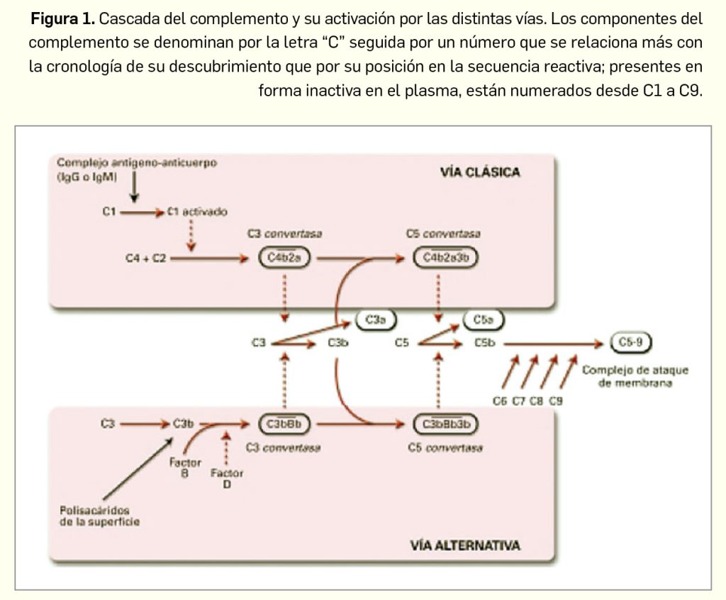 En condiciones fisiológicas, el complemento actúa en los procesos inmunitarios de defensa frente a microorganismos, y su objetivo final es la lisis de los mismos mediante la formación del denominado complejo de ataque de membrana (CAM). El paso más importante para su función biológica es la activación de su tercer componente, C3. La formación de la proteasa responsable de la fragmentación del C3 se puede producir por 3 posibles vías (Figura 1): a) vía clásica, que se inicia por la activación del C1 sobre el anticuerpo (IgG o IgM) unido al antígeno extraño; b) vía alternativa, cuya activación es espontánea o bien consecuencia de la activación previa de la vía clásica, a la que amplifica; y c) vía de las lectinas, incluida frecuentemente dentro de la “vía alternativa”, y que se activa cuando la lectina ligadora de manosa (MBL) reconoce azúcares bacterianos.