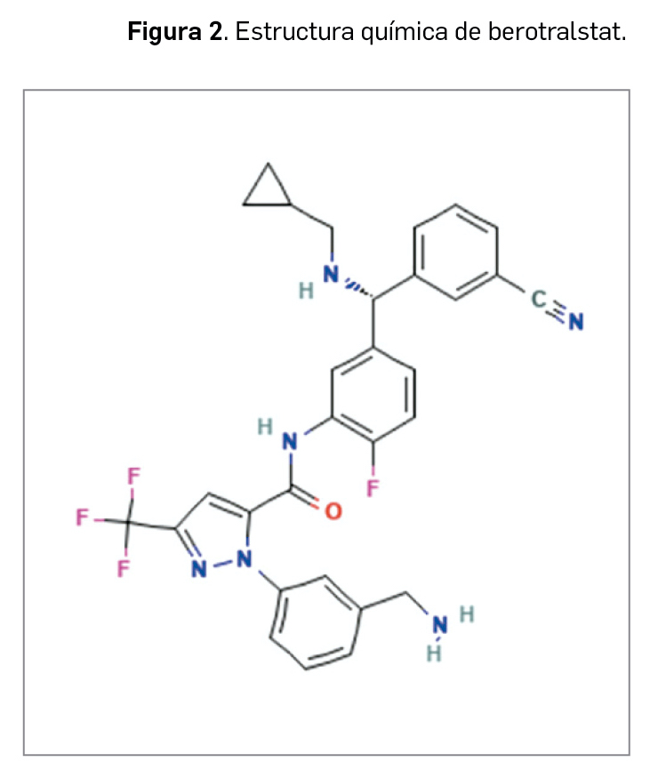 Berotralstat es un nuevo fármaco de molécula pequeña, activo por vía oral, diseñado para actuar como un inhibidor potente y selectivo de la actividad serina proteasa de la calicreína plasmática, una enzima que fisiológicamente participa en la activación del complemento mediante la escisión del cininógeno de alto peso molecular para liberar bradicinina. El potencial terapéutico del nuevo fármaco se explica por su capacidad de suprimir la producción de bradicinina en células endoteliales, de utilidad en pacientes con deficiencia o disfunción de la proteína inhibidora de la C1-esterasa (INH-C1), en quienes está patológicamente aumentada la actividad de la calicreína plasmática y la liberación de bradicinina. Así, el medicamento ha sido autorizado para la prevención rutinaria –terapia oral diaria– de las crisis recurrentes de angioedema hereditario (AEH) en pacientes adultos y adolescentes de al menos 12 años de edad, no pudiéndose usar para el tratamiento de las crisis agudas.