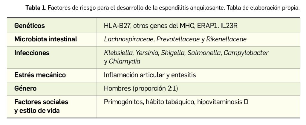 Las hipótesis que intentan explicar la causa de la EA son diversas. La referida a la existencia de un péptido artritogénico asume que una infección bacteriana por algunos agentes infecciosos como Yersinia, Shigella, Salmonella, Campylobacter o Chlamydia en un individuo HLA-B27 induciría una respuesta y reacción autoinmune con lesión tisular crónica. Existe otra teoría, independiente de la presentación antigénica, que se basa en la biosíntesis de la molécula HLA-B27 con plegamiento anómalo de la cadena pesada, dando lugar a un acúmulo de la misma en el retículo endoplasmático que conduciría a una respuesta inflamatoria con producción de citocinas proinflamatorias. Se debe mencionar, por último, la hipótesis que plantea que la disociación y acúmulo de B2m de la molécula HLA-B27 conduciría a una respuesta inmune, con la subsiguiente producción de citocinas proinflamatorias.