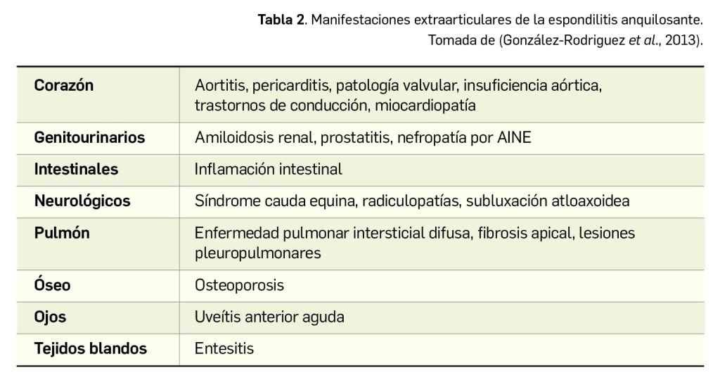 En cuanto a la enfermedad intestinal, además de la conocida asociación con la colitis ulcerosa o la enfermedad de Crohn, se han demostrado lesiones en íleon terminal y colon en más del 50 % de pacientes con EA. Asimismo, en aquellos pacientes con mayor actividad inflamatoria se observa disminución de la masa ósea (osteoporosis) vertebral pudiendo contribuir a la deformidad de los cuerpos vertebrales. Por último, la neuropatía es otra comorbilidad asociada a EA: los síndromes mielocompresivos son más frecuentes en estos pacientes que en población general y suelen deberse a fracturas, lesiones destructivas discales y estenosis espinal por osificaciones ligamentosas. La anquilosis hace al raquis más frágil ante traumatismos, siendo el síndrome de la cauda equina una rara complicación en pacientes con espondilitis anquilosante. La subluxación atlo-axoidea es menos frecuente que en pacientes con artritis reumatoide.