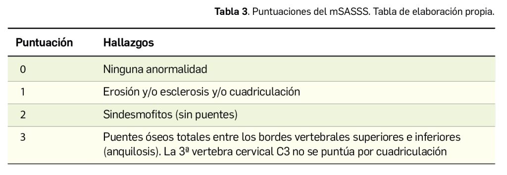 Estos criterios describen los parámetros necesarios para el diagnóstico definitivo, mientras que los métodos de puntación radiográfica permiten evaluar el daño estructural: por ejemplo, el mSASSS (modified Stoke Ankylosing Spondilytis Spinal Score) es un método validado para evaluar los cambios estructurales crónicos en radiografías convencionales gracias a que emplea puntuaciones para cuantificar las anomalías en los bordes de las vértebras, puntuándose cada borde vertebral superior e inferior como se resume en la Tabla 3.