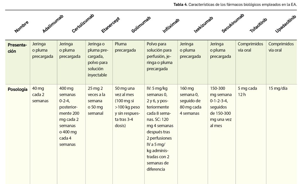 En aquellos pacientes con alta actividad de la enfermedad y que no hayan presentado una óptima respuesta a AINEs, estaría indicada la terapia biológica con inhibidores de factor de necrosis tumoral (TNF-α), encontrándose en este grupo infliximab, adalimumab, golimumab, certolizumab pegol y etanercept. Si el tratamiento con el primer anti-TNF falla, se puede iniciar tratamiento con otro anti-TNF o con un inhibidor de la IL-17, como son secukinumab o ixekizumab. Por último, recientemente se han sumado al tratamiento los inhibidores de JAK cinasas como upadacitinib. En la siguiente tabla (Tabla 4), basada en el informe para Guía farmacoterapéutica de 2022 de Hospitales de Andalucía, se resumen las características más relevantes de los fármacos biológicos empleados en la EA.