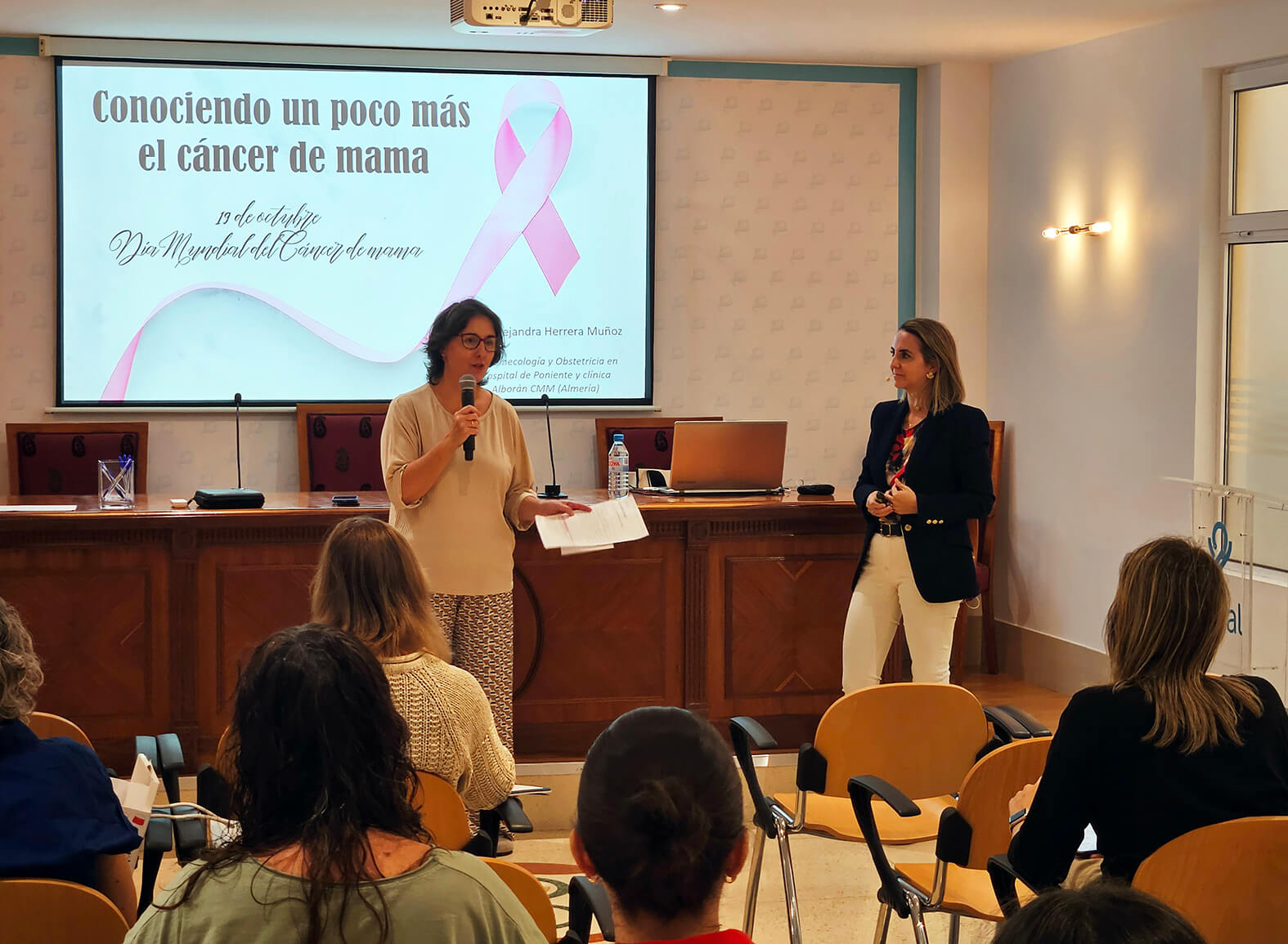 La jornada ha contado con dos ponencias. La primera de ellas, impartida por Alejandra Herrera Muñoz, especialista en Ginecología y Obstetricia en el Hospital de Poniente y Clínica Alborán CMM, bajo el título ‘Conociendo un poco más el cáncer de mama’. La segunda contó con el especialista en Ginecología y Obstetricia en el Hospital de Poniente y Clínica Vithas, Pablo Romero Duarte, que se centró en el abordaje del cáncer de mama.