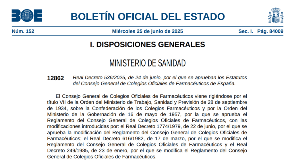 El Consejo de Ministros aprobó el 25 de junio el Real Decreto que establece los nuevos Estatutos del Consejo General de Colegios Oficiales de Farmacéuticos (CGCOF). Este hito supone la culminación de un proceso histórico de modernización jurídica, promovido desde hace años por la organización colegial.