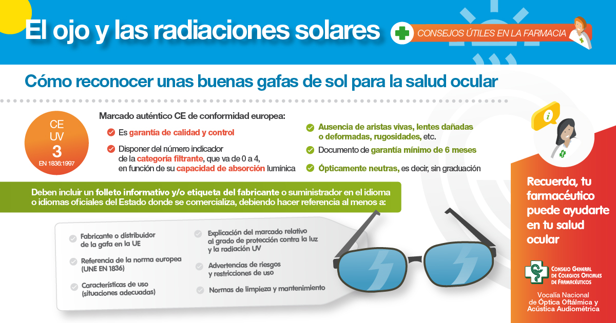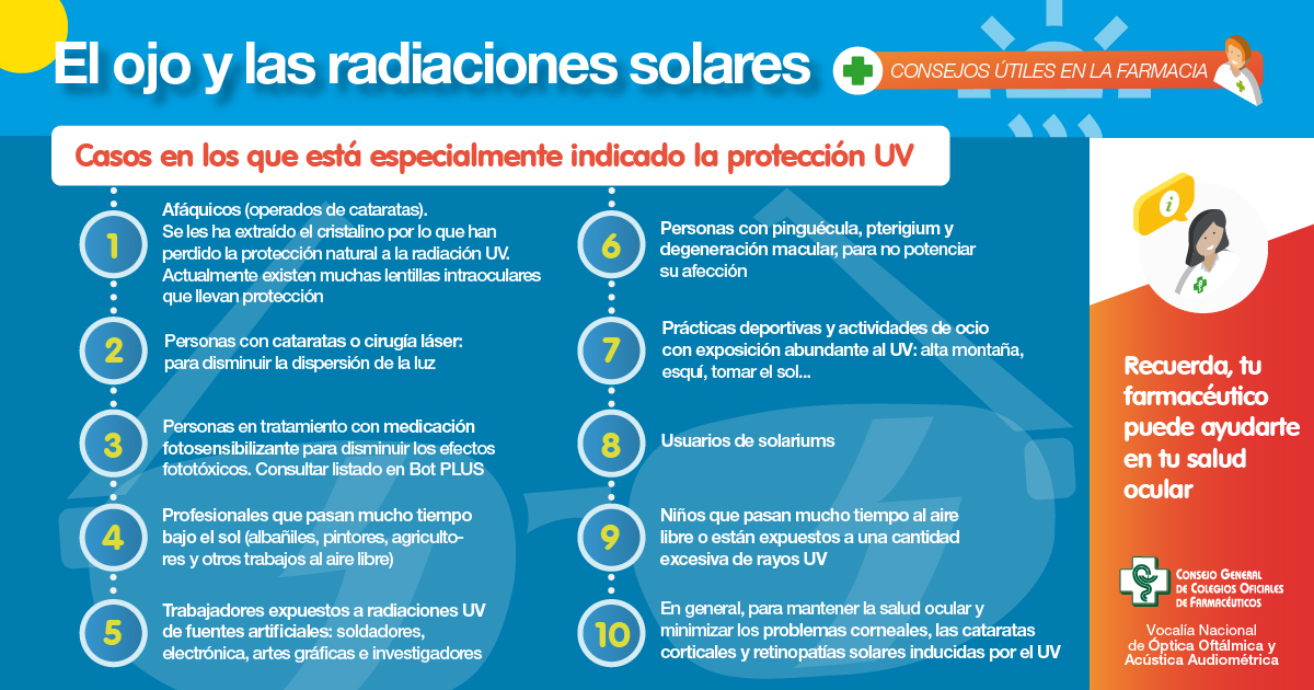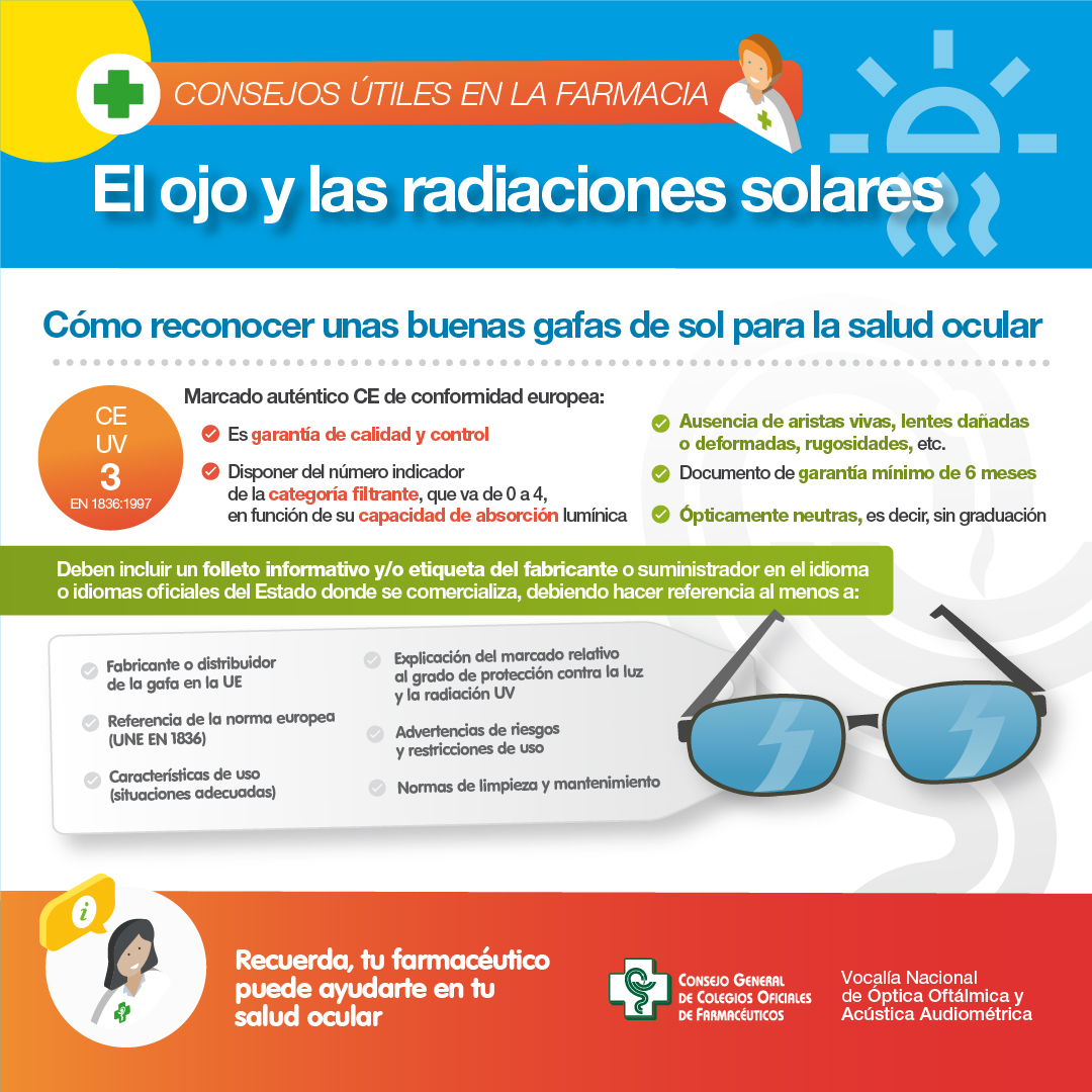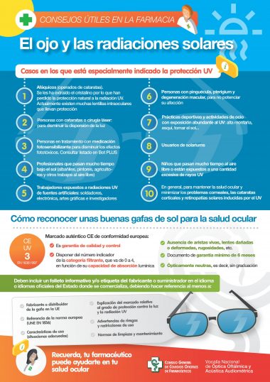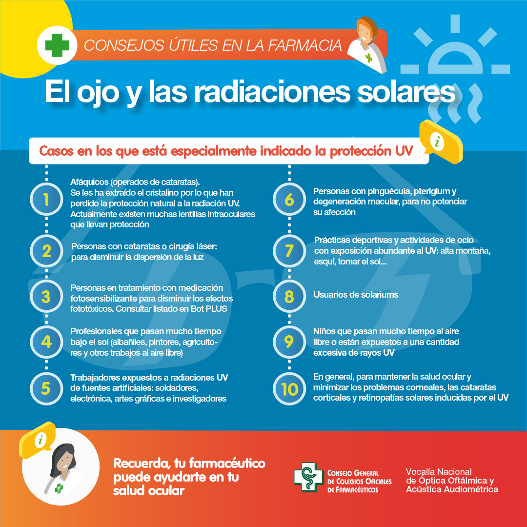 La Vocalía de Farmacéuticos de Óptica Oftálmica y Acústica Audiométrica ha elaborado la infografía “El ojo y las radiaciones solares” con el objetivo de asesorar desde la oficina de farmacia sobre los aspectos relacionados con la salud ótica en la época estival.