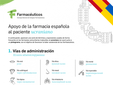 A continuación, aparecen una serie de términos y expresiones usados de forma frecuente en las farmacias comunitarias traducidos al ucraniano junto a un pictograma, con el objetivo de favorecer la labor asistencial de los farmacéuticos.